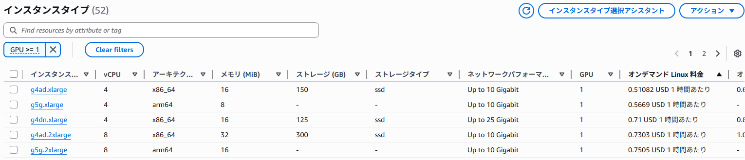 今回は、NVIDIA製GPU搭載でWindows対応しているタイプで一番価格が安いg4dn.xlargeがVRAMも十分あるので検証に使用したいと思います。