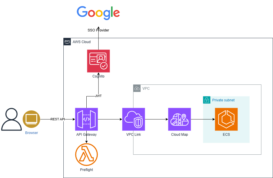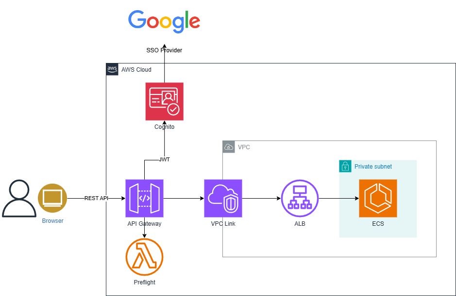 #VPC やサブネット、Cognito の経由で Google の SSO 認証などは既存のインフラとしました。