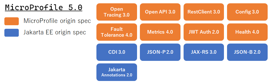 #早速ですがMicroProfile5.0に含まれている仕様[1]を並べると下のとおりとなります。