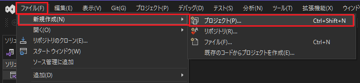 左上のタブから「ファイル」→「新規作成」→「プロジェクト」を選択します。