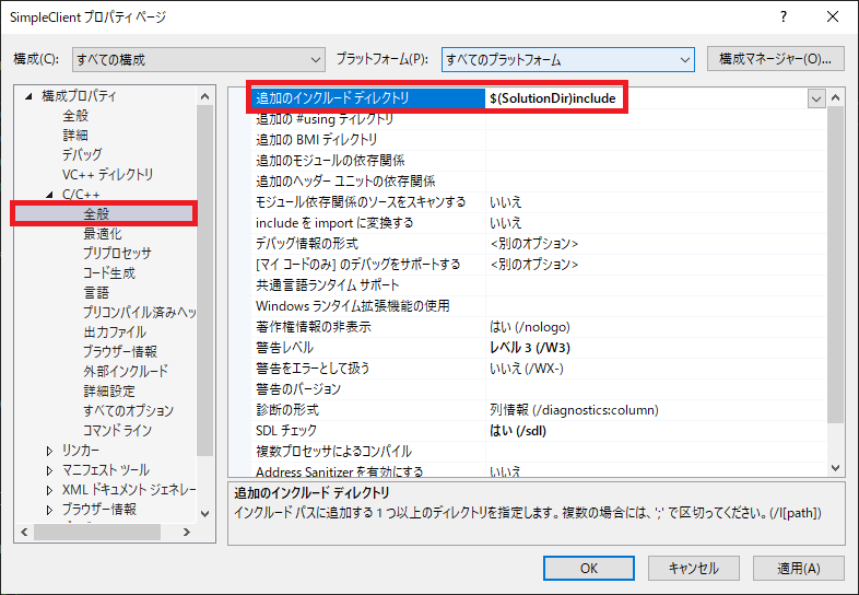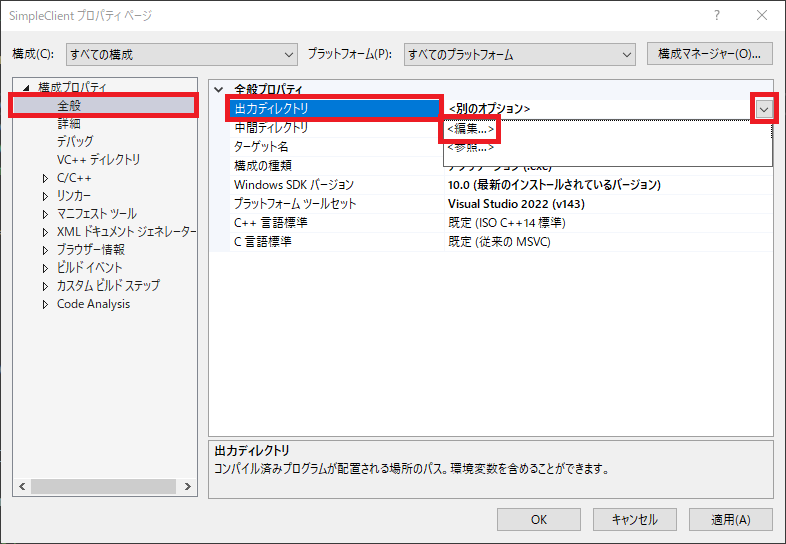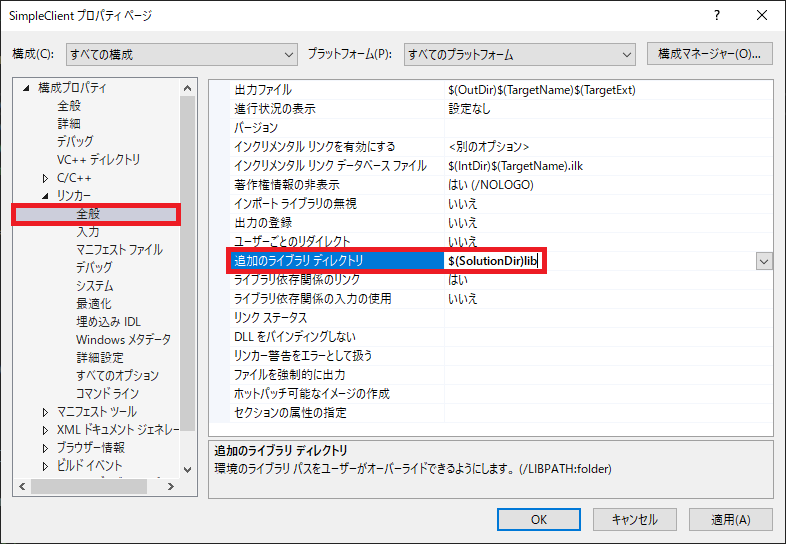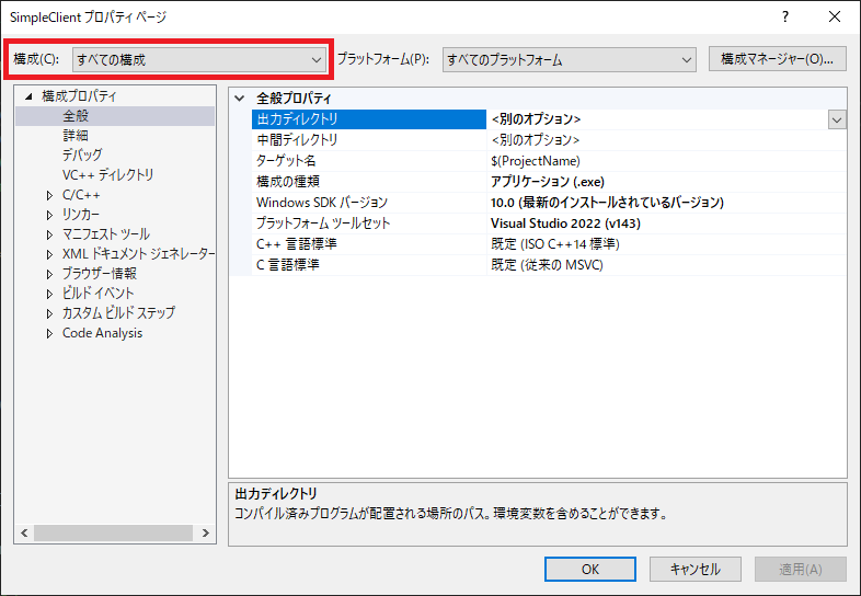 SimpleClientプロパティページの上部にある「構成」を「すべての構成」に設定します。