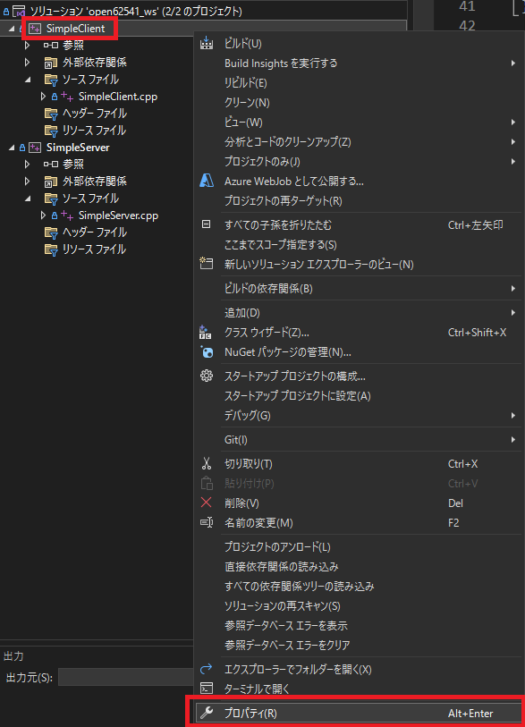 ソリューションエクスプローラー内の「SimpleClient」を右クリックし,プロパティを選択します。
