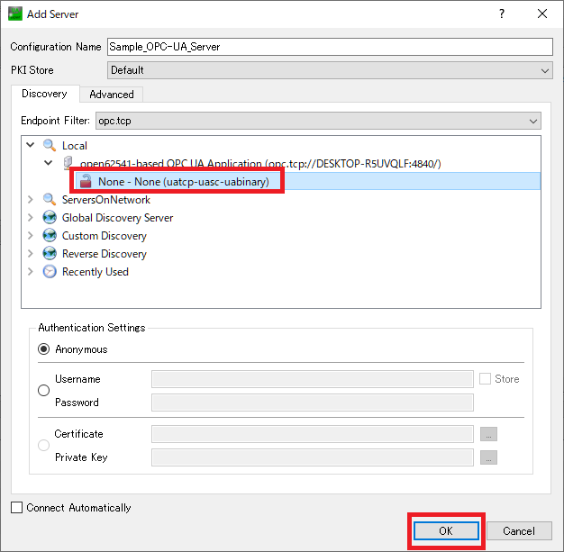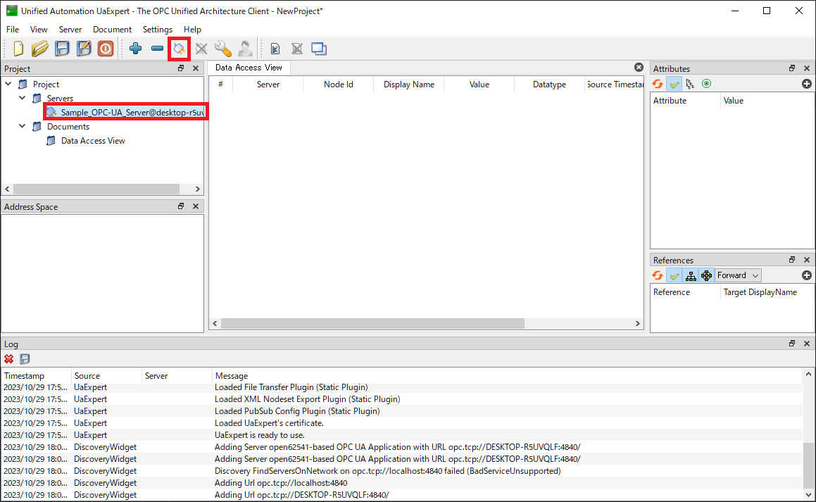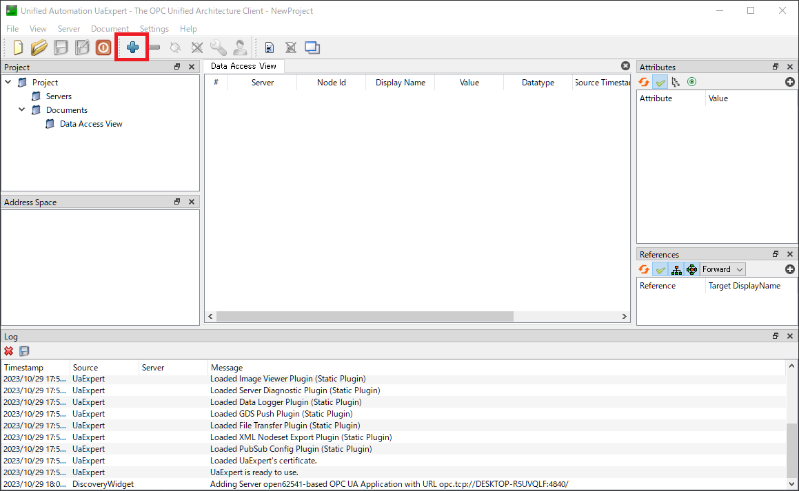 サーバが起動できたら,OPC-UAクライアントツールであるUaExpertを起動します。