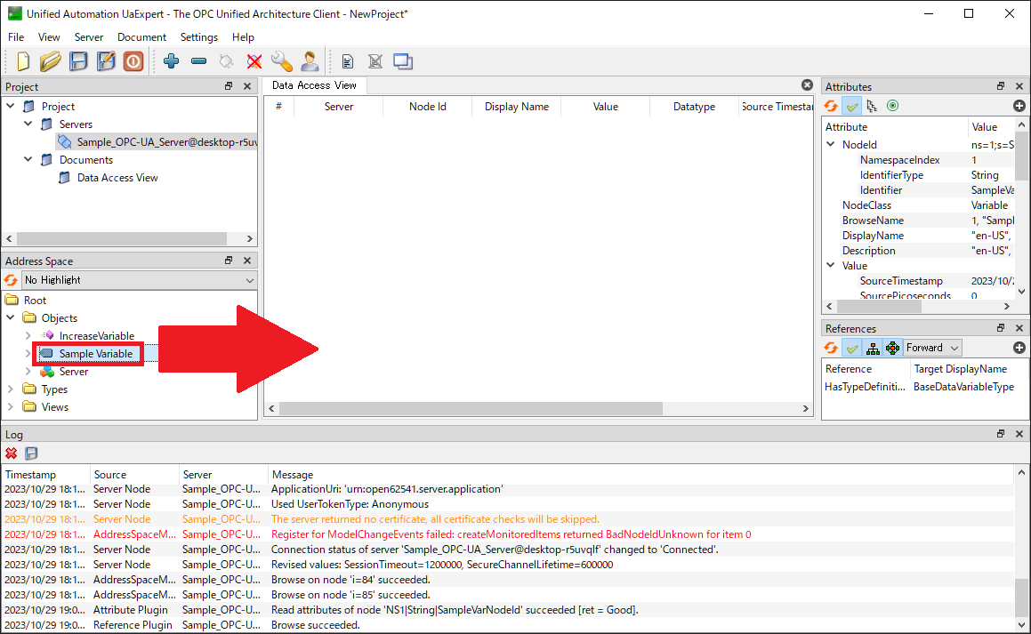 その中で,「Objects」フォルダ内に存在する「Sample Variable」ノードを選択し,画面中央の「Data Access View」欄にドラッグ&ドロップしましょう。