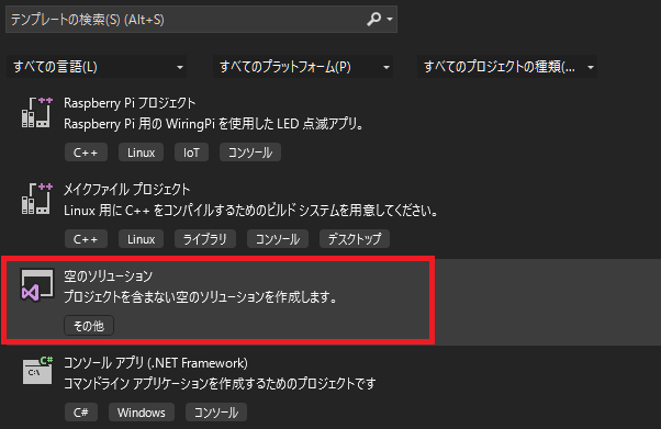 プロジェクトテンプレートでは,「空のソリューション」を選択します。