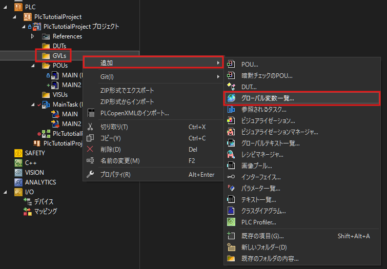 「GVLs」フォルダを右クリックして,「追加」>「グローバル変数一覧」をクリックします。