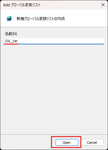 変数リスト名は「GVL_Var」として「Open」をクリックします。