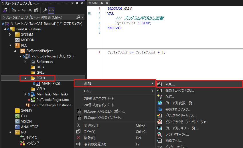 「POUs」フォルダを右クリックして,「追加」>「POU」を選択します。