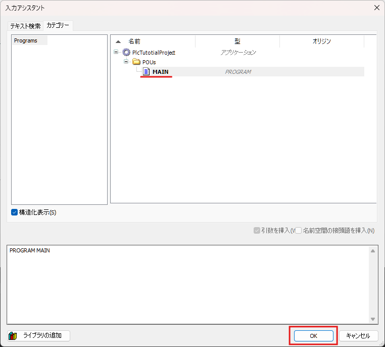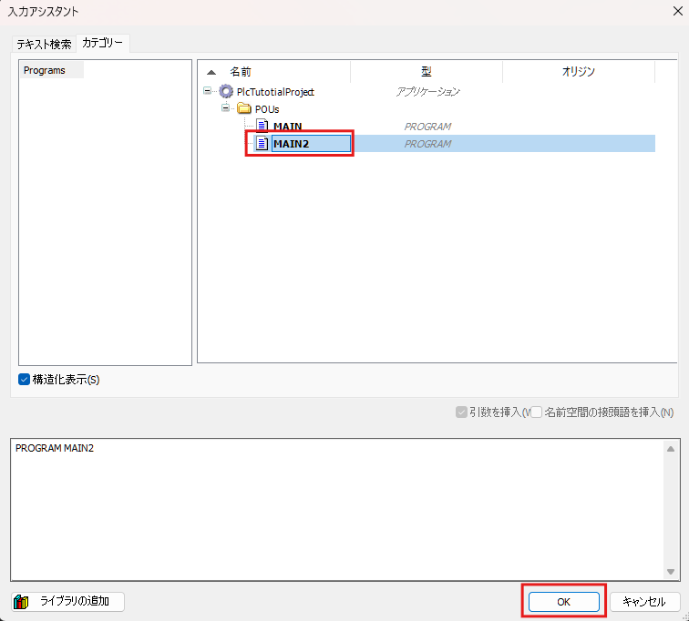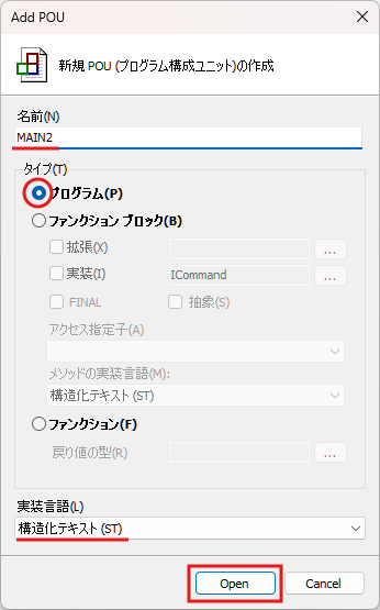 プログラム名は「MAIN2」とし,タイプは「プログラム」を,実装言語は「構造化テキスト」(ST)を選択してOpenをクリックします。