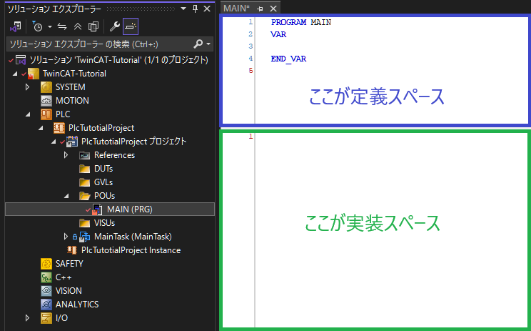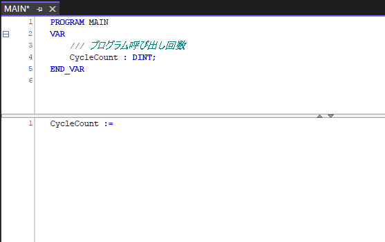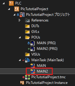 「POUs」フォルダ内にある「MAIN(PRG)」をクリックして編集画面を開きます。