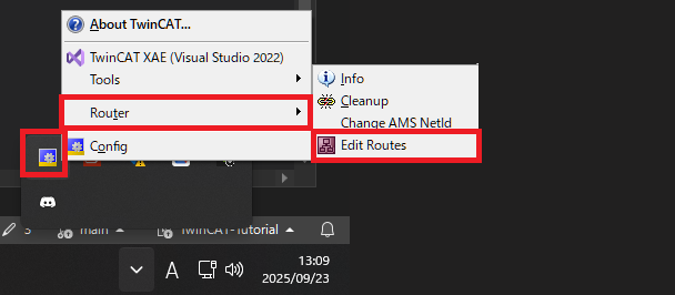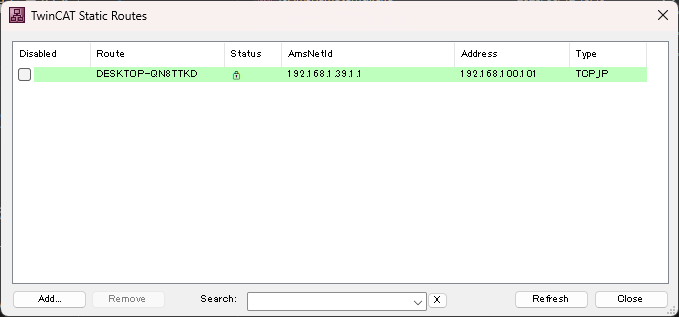 「TwinCAT Static Routes」ウィンドウが表示されるため,下記のように緑色となっていれば接続が行えています。