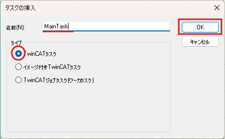 タイプは「TwinCATタスク」を選択し,名前を「MainTask」として「OK」をクリックします。