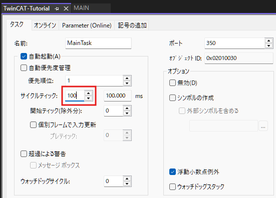 これは,TwinCATプロジェクトを作成したときに生成されるタスクの実行周期が10msであるためです。