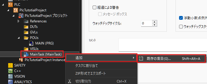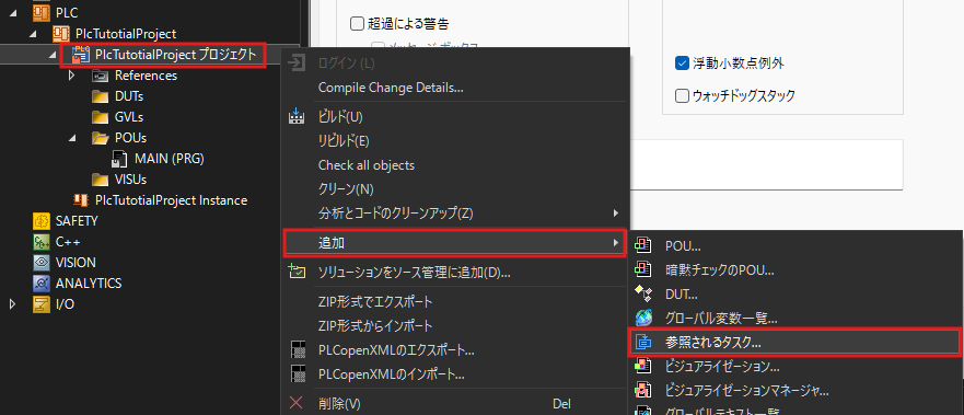 「PLCプロジェクト」を右クリック>「追加」>「参照されるタスク」を選択します。