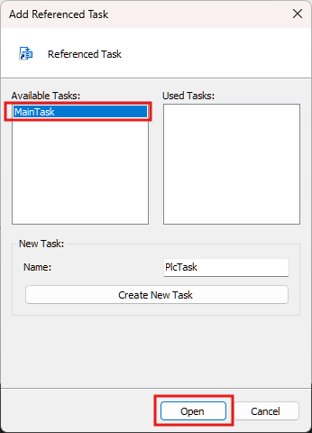 割り当て可能なタスクが表示されるので,先ほど作成した「MainTask」を指定して「Open」をクリックします。