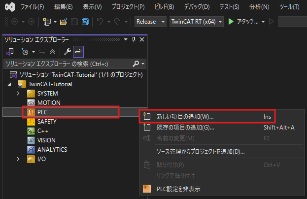 #ソリューションエクスプローラーにて「PLC」を右クリックして,「新しい項目の追加」をクリックします。