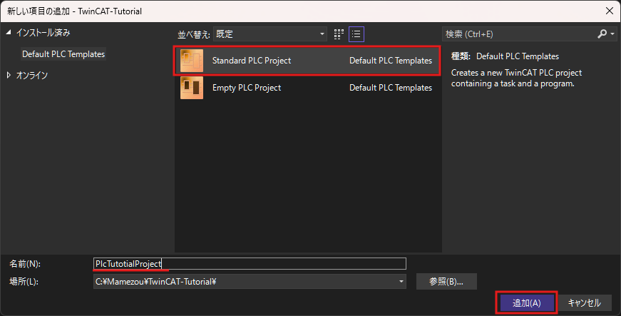 今回は「PlcTutorialProject」として追加ボタンをクリックします。