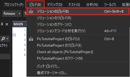 IDE上部の「ビルド」タブ>「ソリューションのビルド」をクリックします。