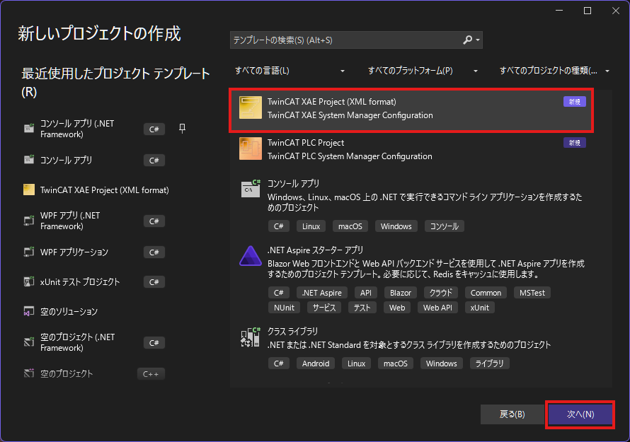 プロジェクトテンプレートには「TwinCAT XAE Project (XML format)」を選択します。