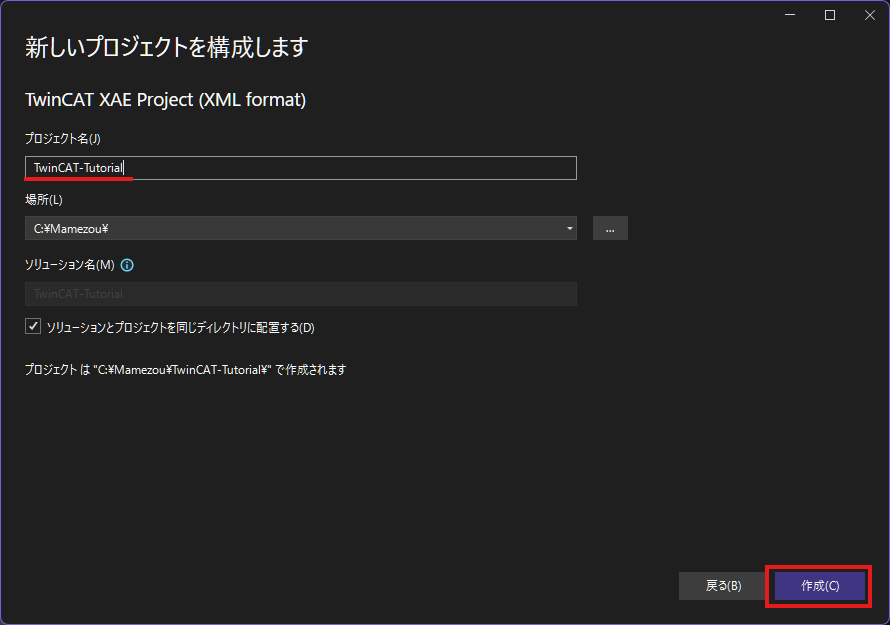 プロジェクト名・ソリューション名は「TwinCAT-Tutorial」とします。