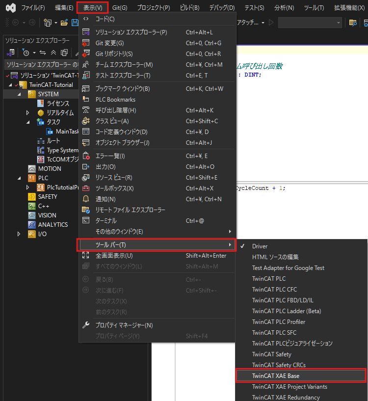 IDEを開き,「表示」タブ>「ツールバー」>「TwinCAT XAE Base」をクリックしてチェックを入れます。