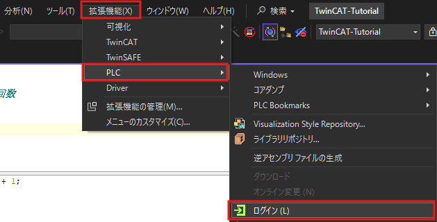 「拡張機能」タブ>「PLC」>「ログイン」を選択してログインします。