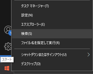 #画面左下のWindowsマークを右クリックし、「検索」を選択します。